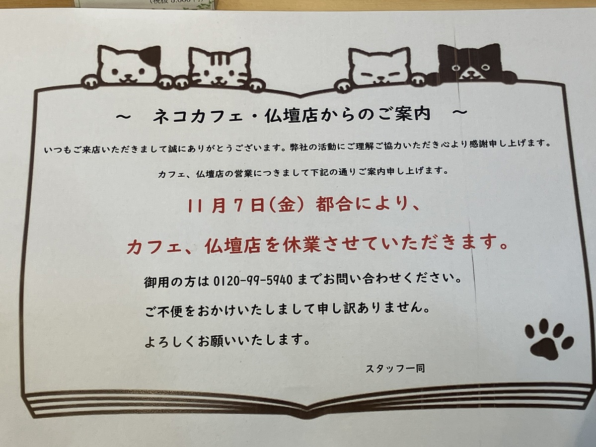 都合により、11月7日(金)ネコカフェ、仏壇店の営業をお休みさせて頂きます。ご不便をおかけいたしますが、ご理解ご協力の程、よろしくお願い申し上げます。