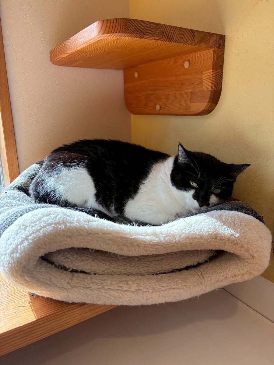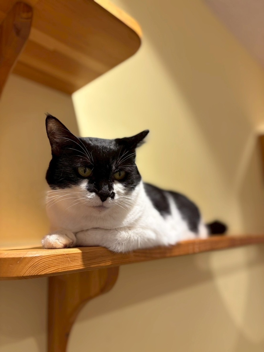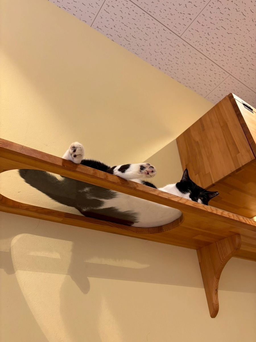 入口真上のキャットウォークがくーちゃんの定位置。時折キャットウォークを巡回しては他のねこちゃんに遭遇すると唸って鳴いて、また戻る😅…そんな姿をお客様もよく見かけたと思います🤭