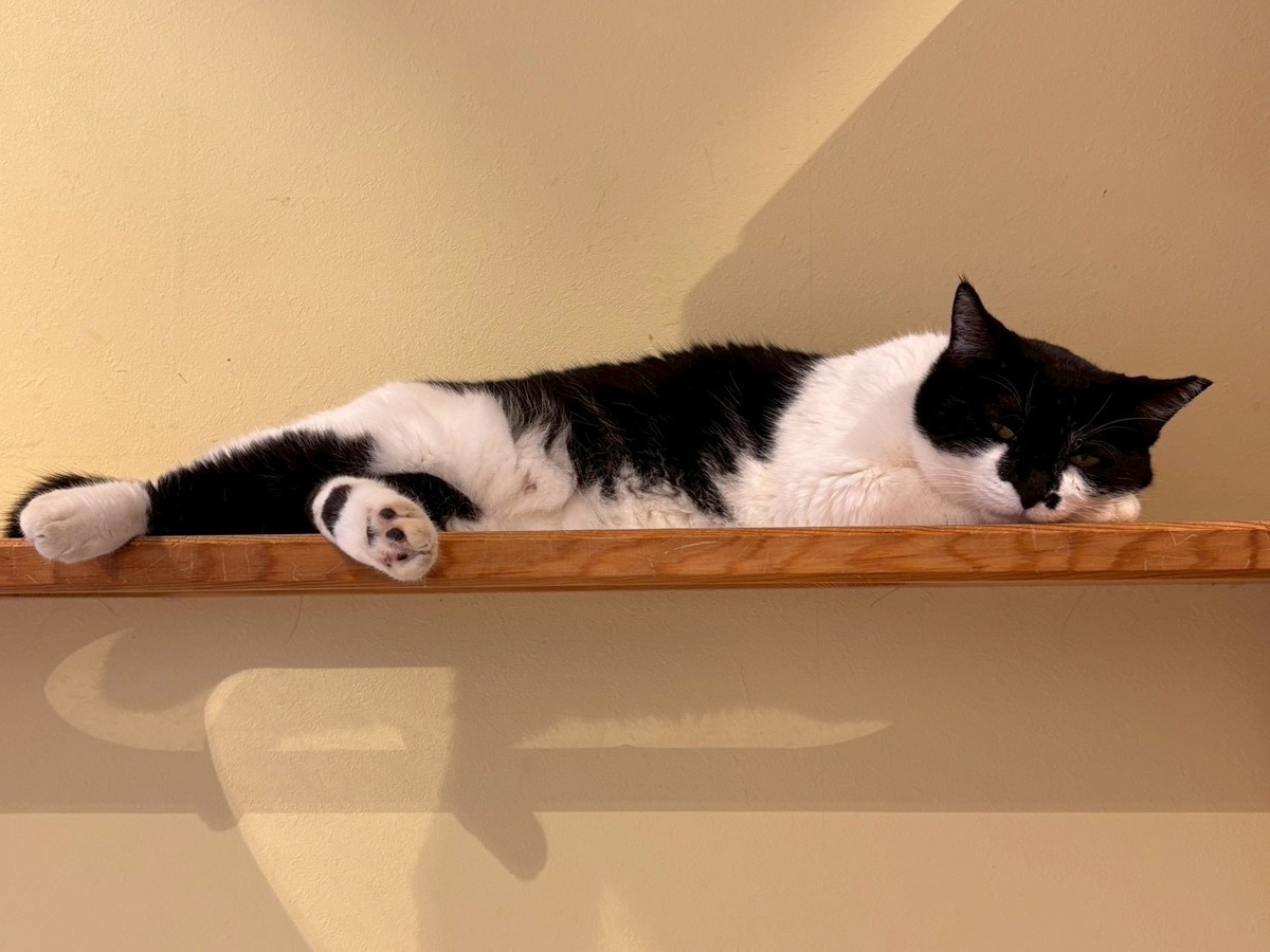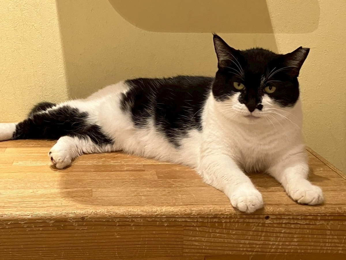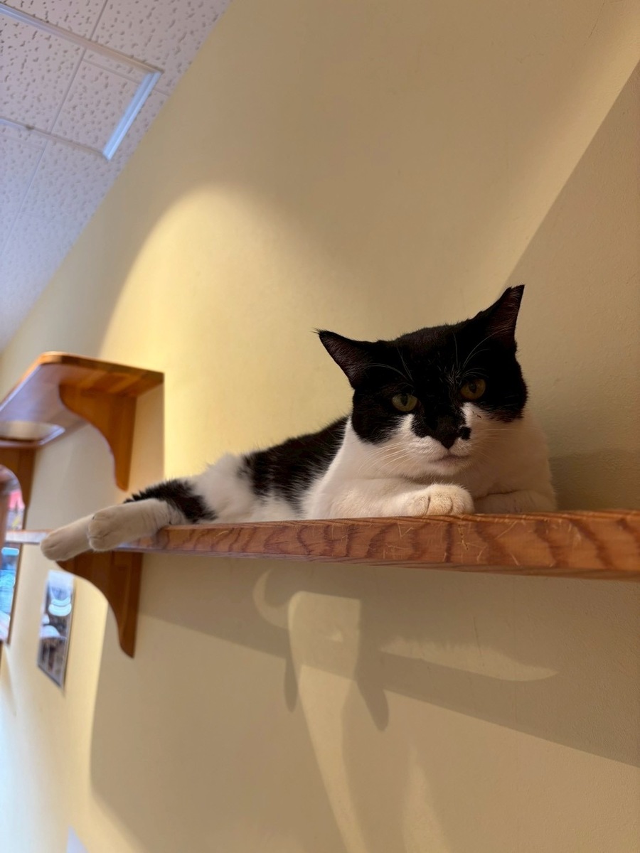 入口真上のキャットウォークがくーちゃんの定位置。時折キャットウォークを巡回しては他のねこちゃんに遭遇すると唸って鳴いて、また戻る😅…そんな姿をお客様もよく見かけたと思います🤭