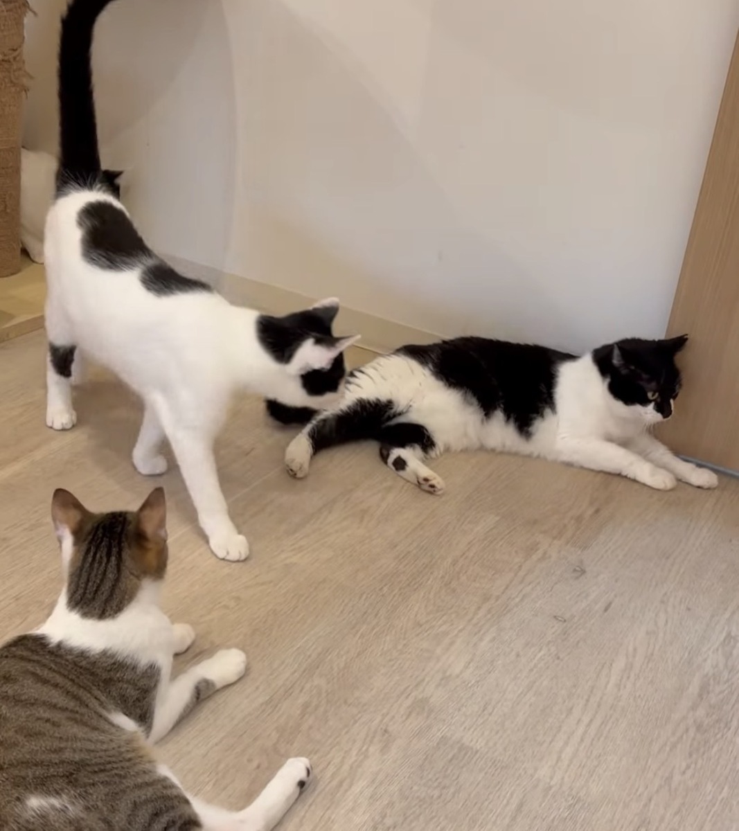 他のねこちゃん達が側にいても唸ることも無くなり、だんだんと下に降りて来てフロアで過ごすように✨